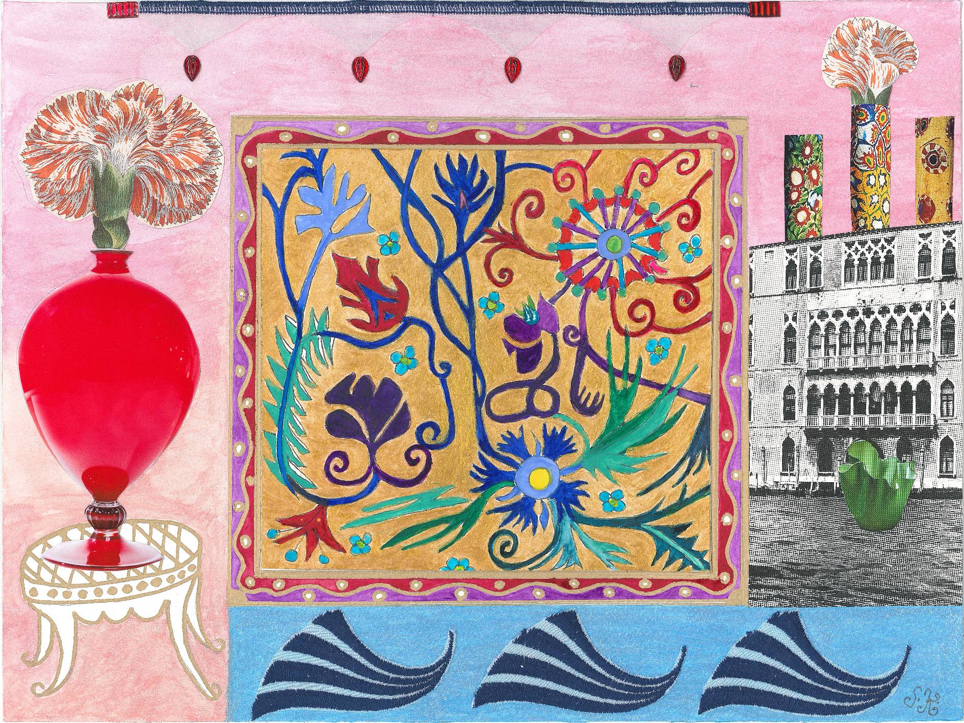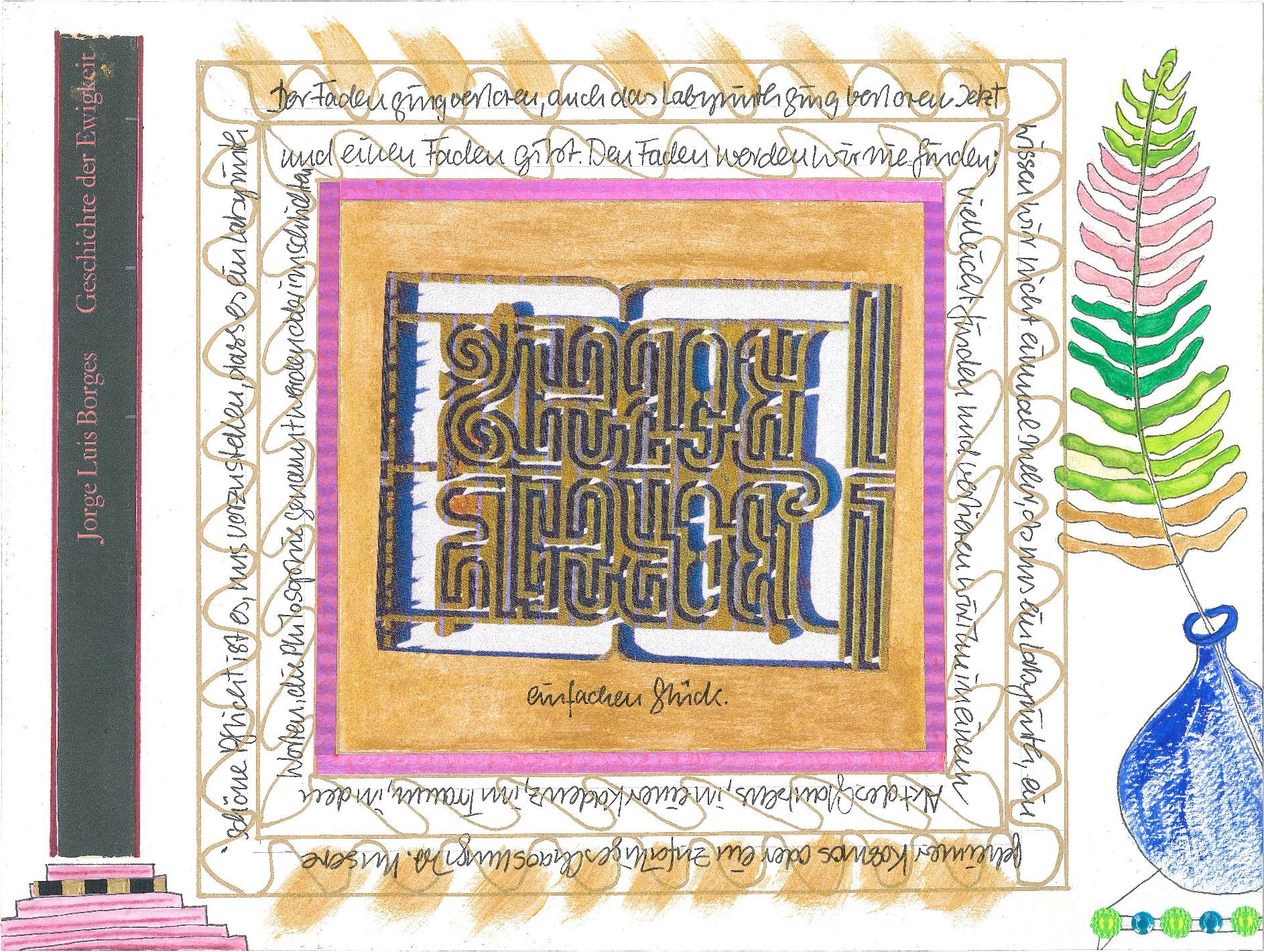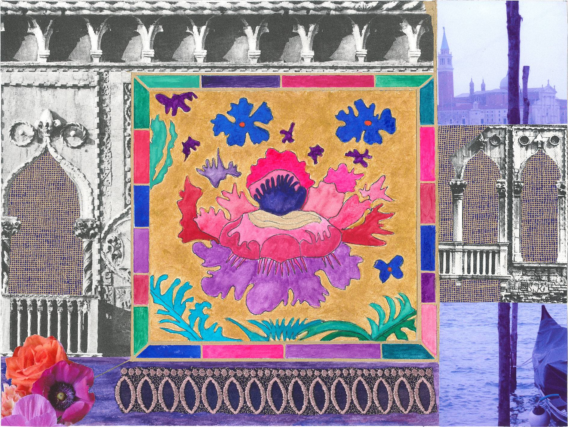 Collagen mit Original-Zeichnungen, Fotografien, Buntpapieren, Textilien.