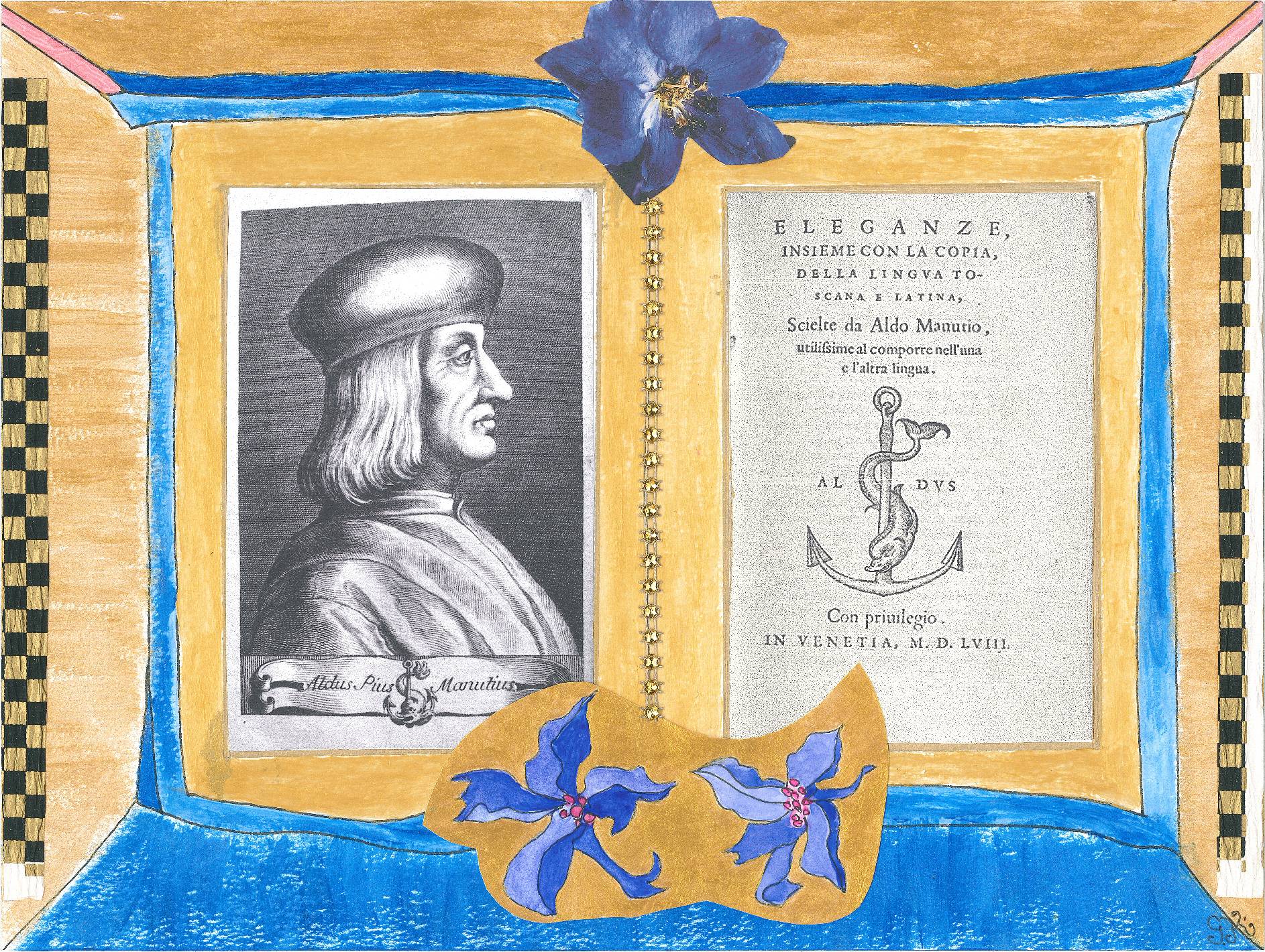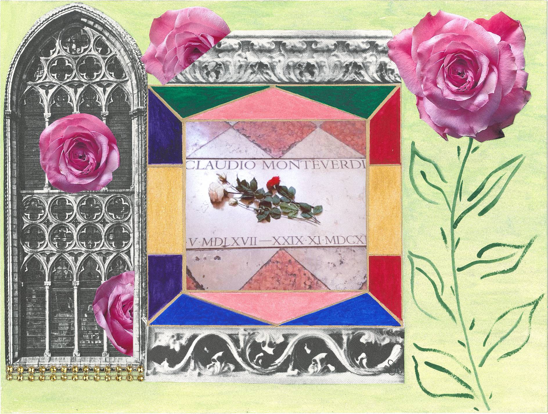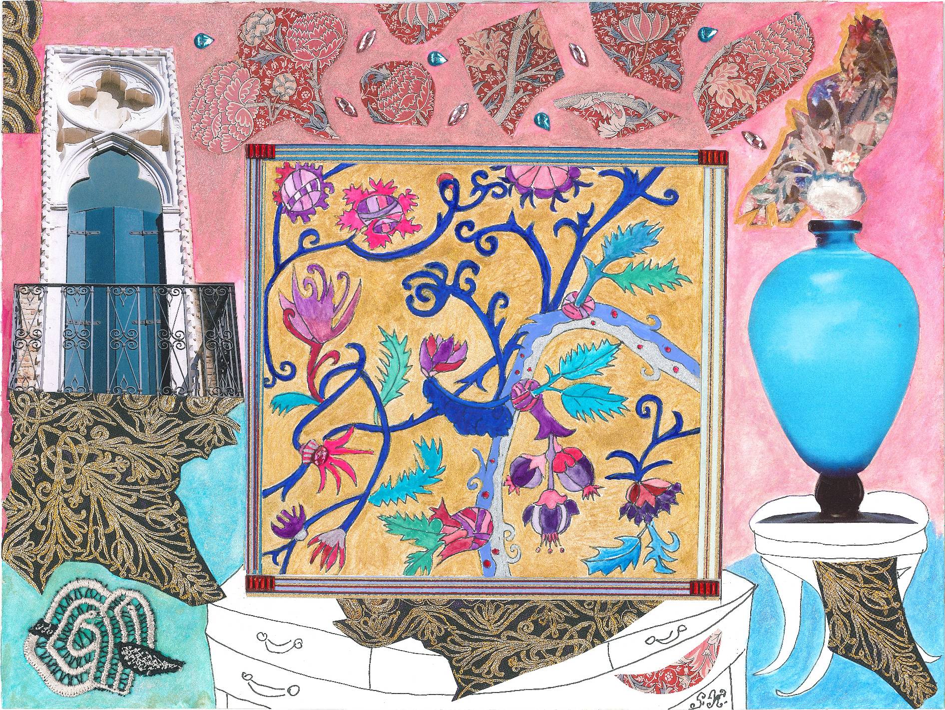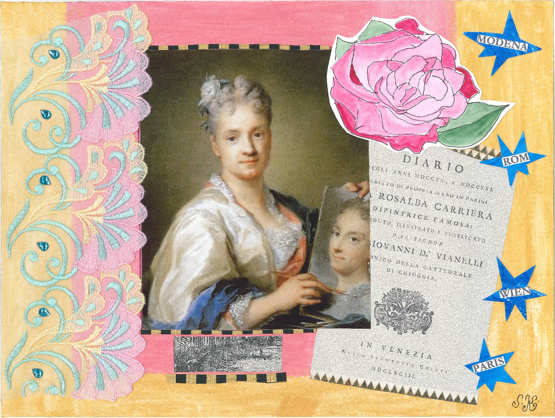 Collagen mit Originalzeichnungen, Fotografien, Textauszügen, Buchcover, Buntpapieren, Textilien, Vintage-Strass.
